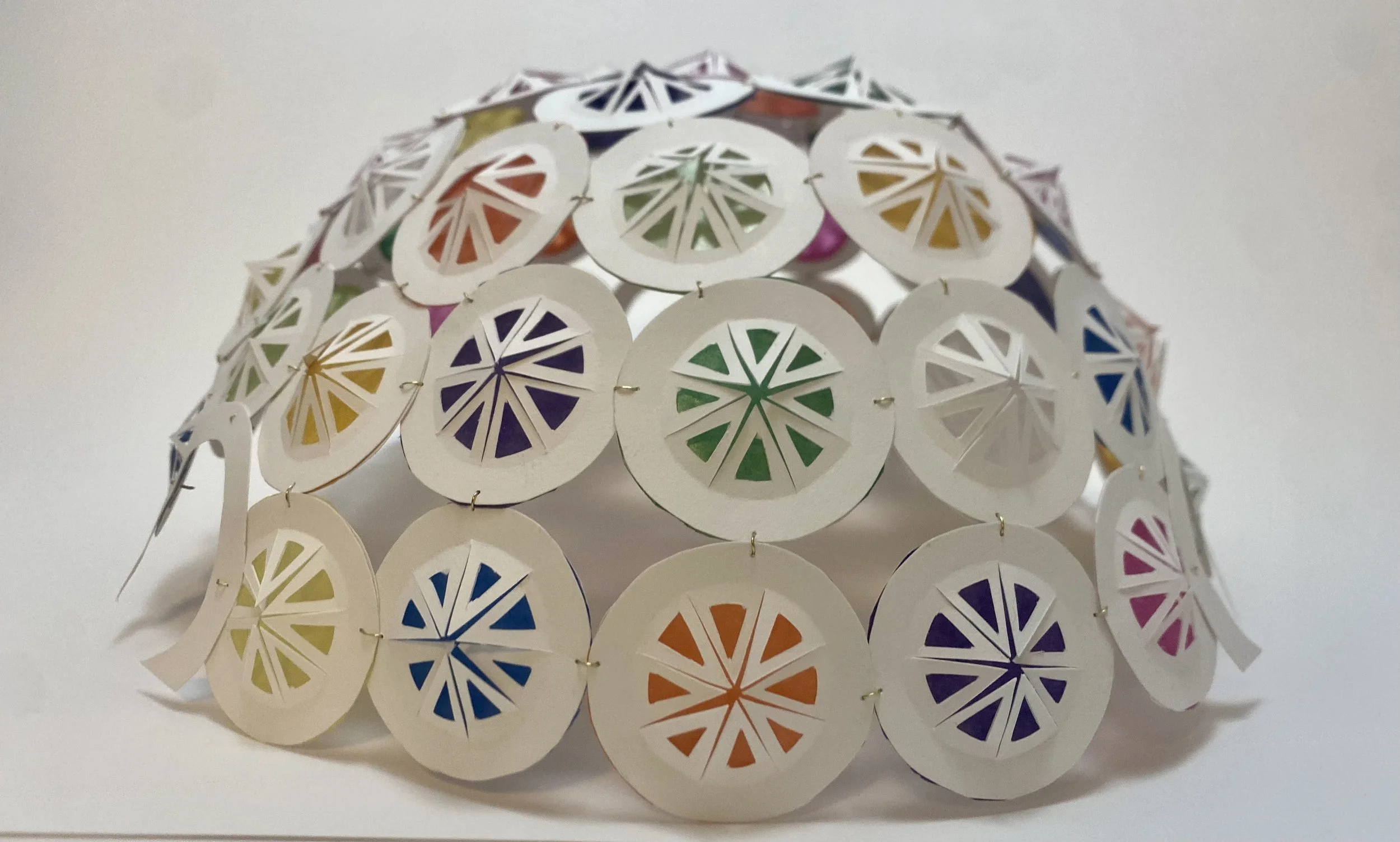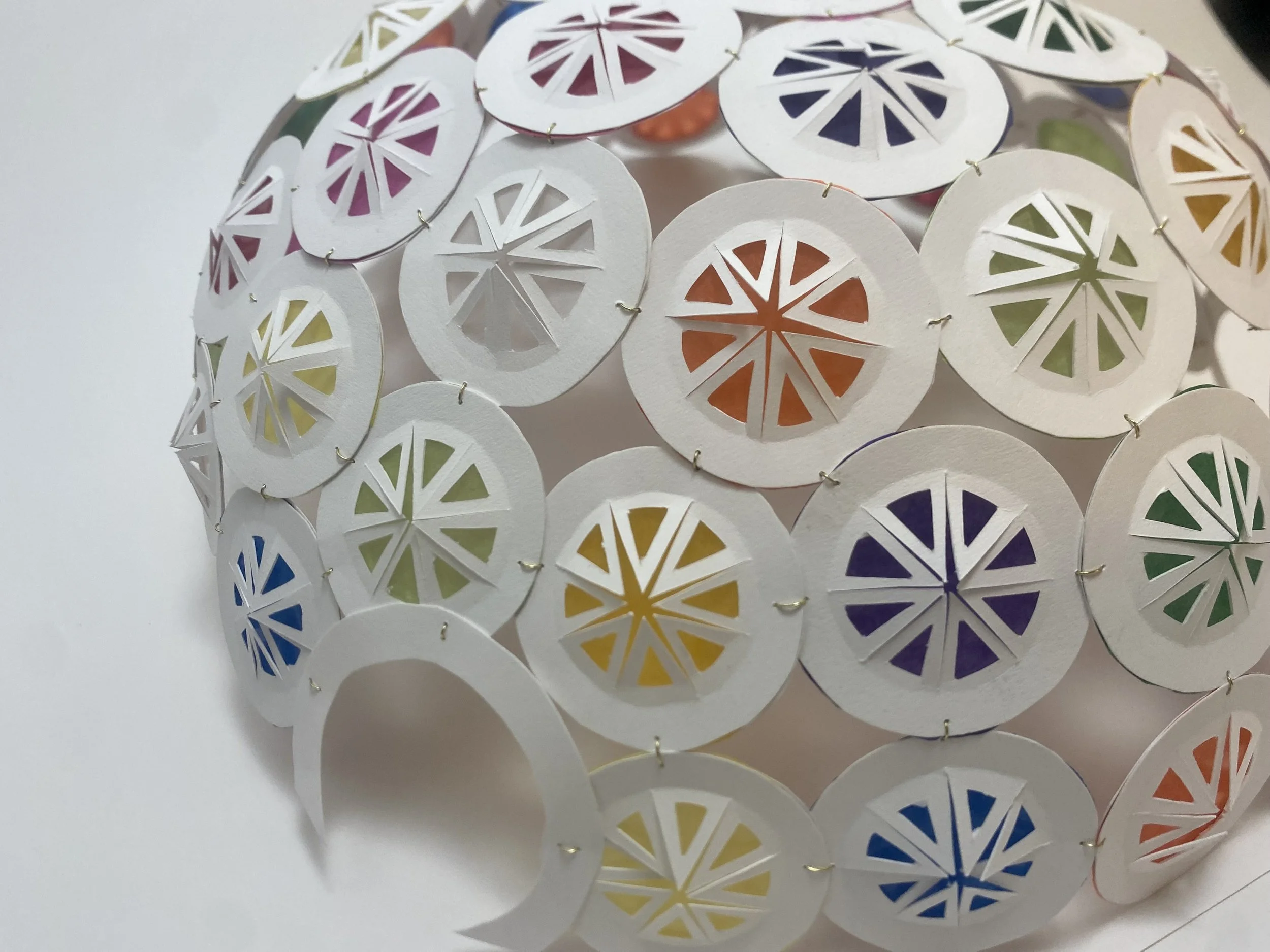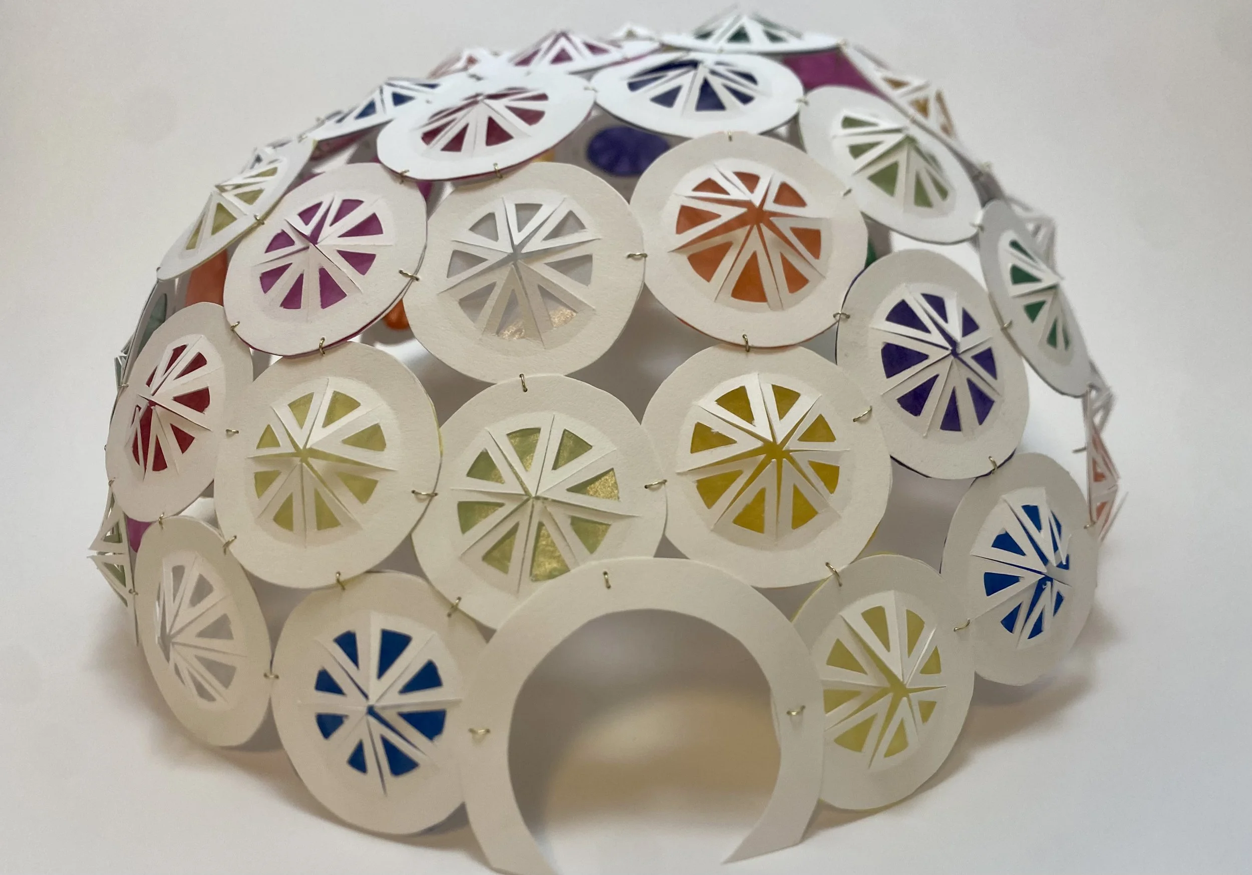 Kaleidoscope is a model of a dome-shaped structure made of circular elements with geometric cutouts, designed to function as a walk-in kaleidoscope. The structure incorporates three layers per piece—bristol board, colored paper, and geometric cutouts—to create a vibrant, peaceful atmosphere.