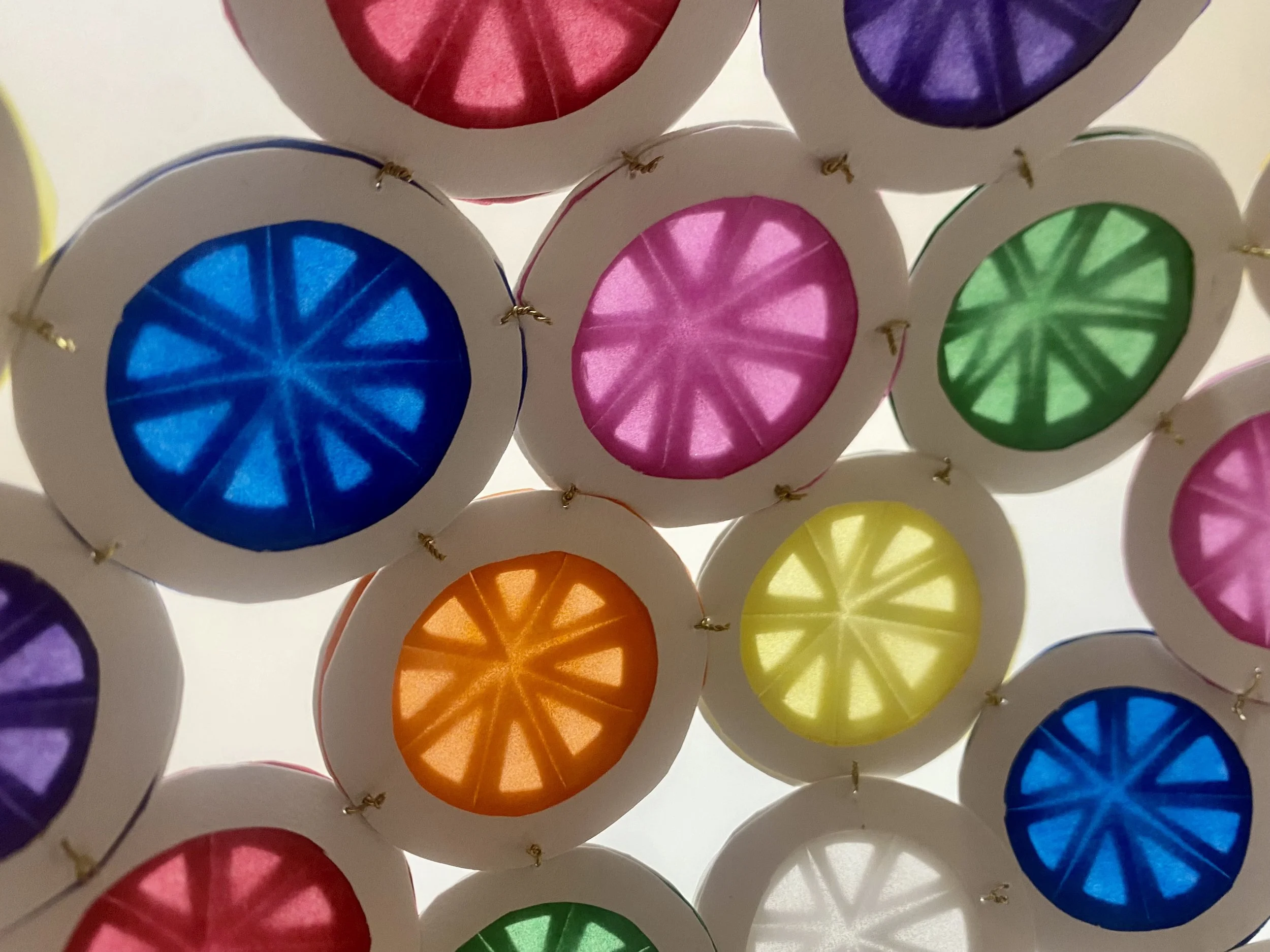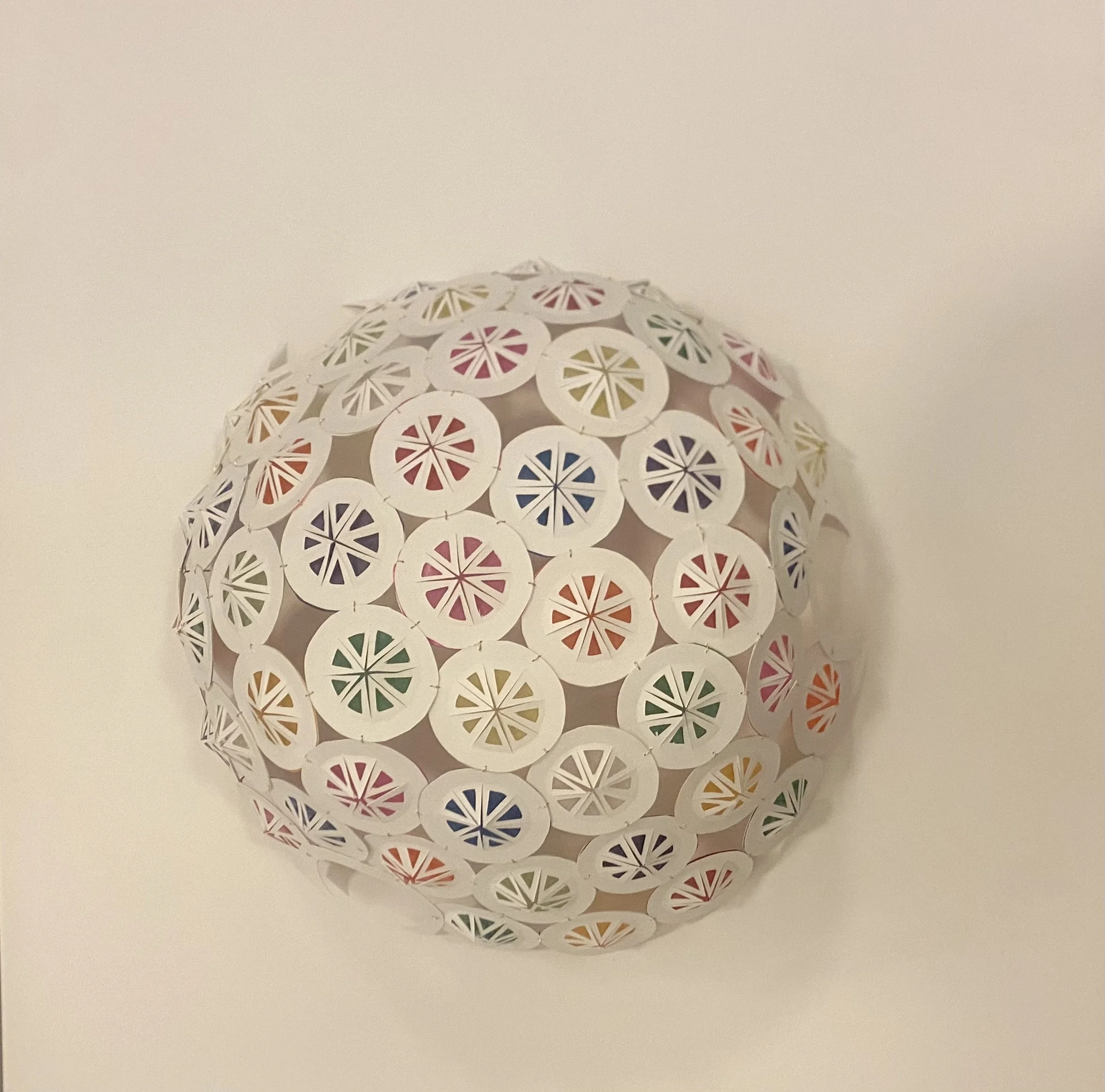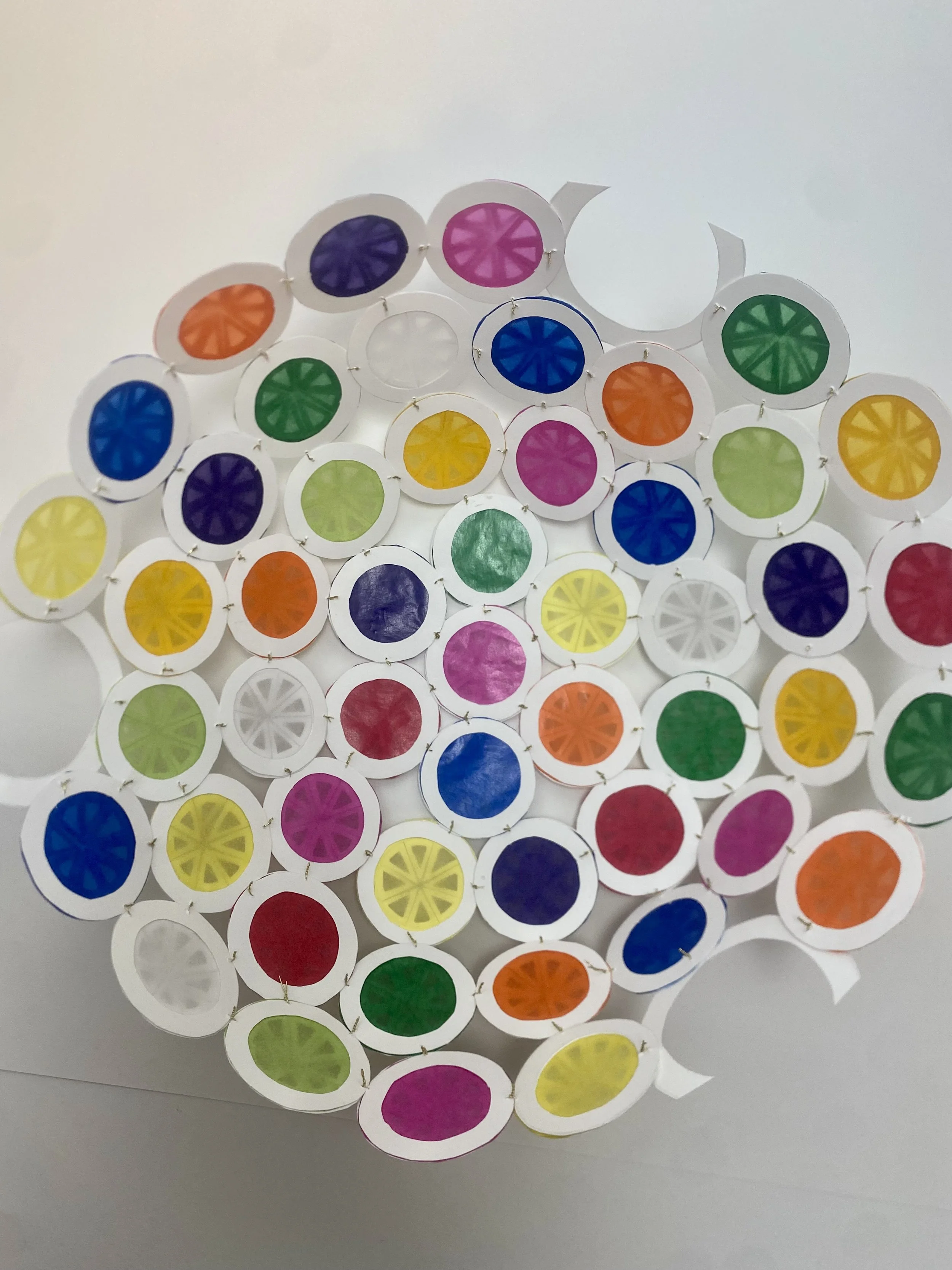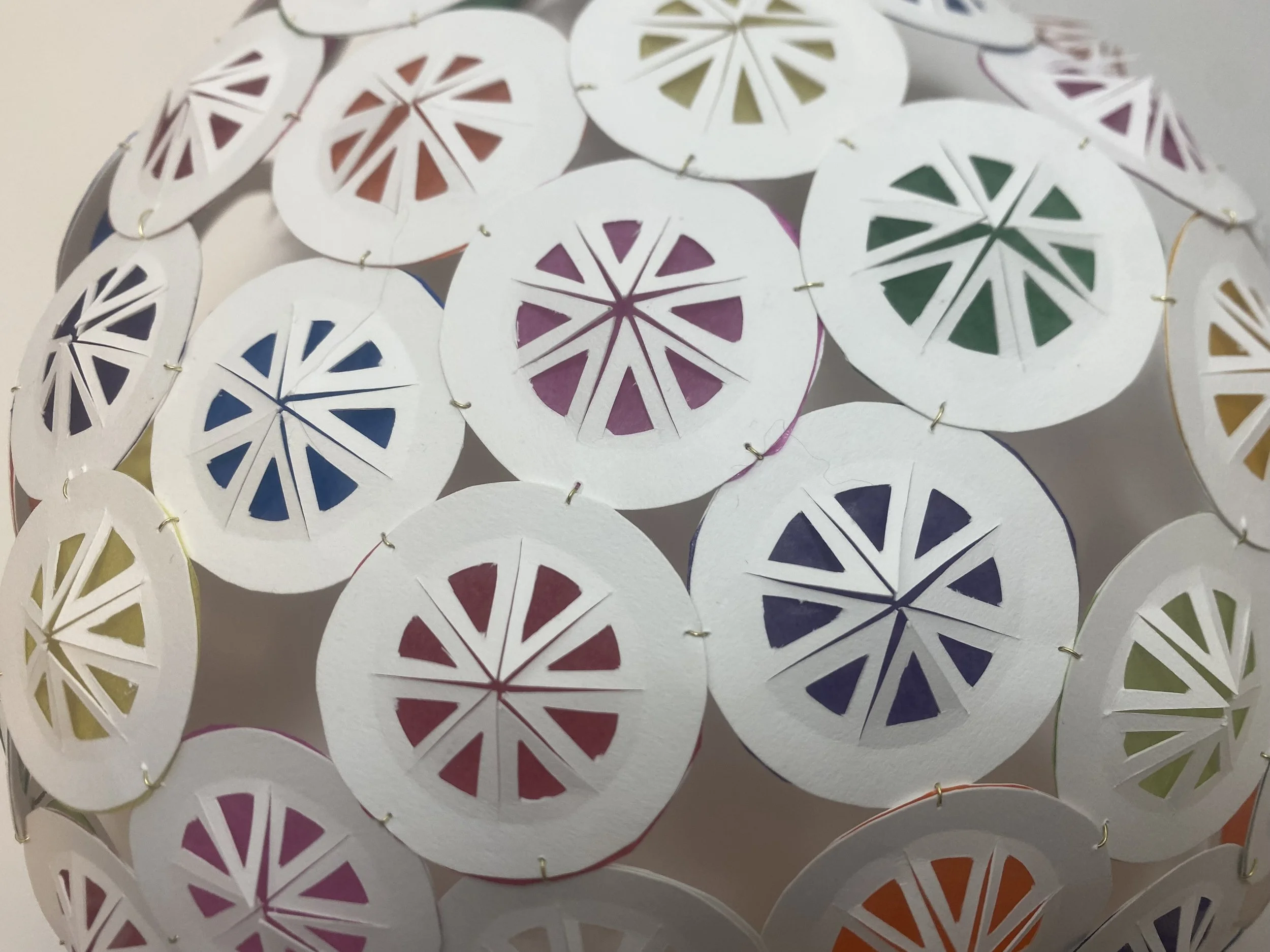 Kaleidoscope is a model of a dome-shaped structure made of circular elements with geometric cutouts, designed to function as a walk-in kaleidoscope. The structure incorporates three layers per piece—bristol board, colored paper, and geometric cutouts—to create a vibrant, peaceful atmosphere.